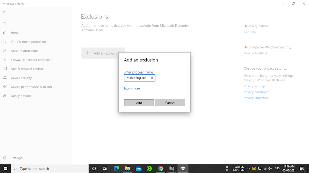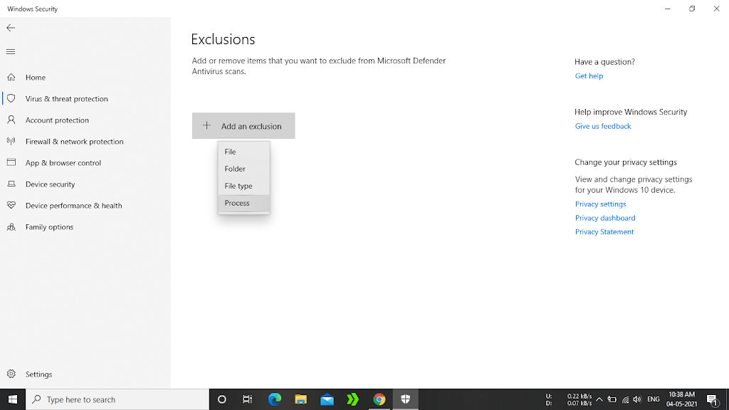 Step 8: Click on the “Add an exclusion” button and select “Process” from the dropdown.